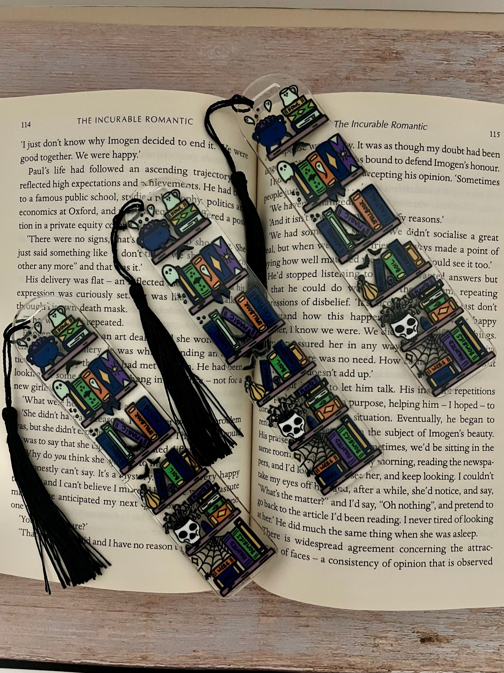 Spooky Library Bookmark is a double-sided acrylic design and waterproof (do not soak)